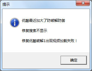 1、关闭杀软,打开帆哥破解收费电影,软件提示框:重新修复了优酷破解通道