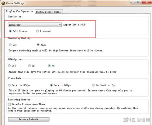 小贴士:游戏全屏与窗口化与否也可以通过下面的full screen和windowed来选择;另外大家如果配置要求不高的话,建议最好选择低于电脑屏幕的分辨率,这样可以大幅度减少卡顿出现。
