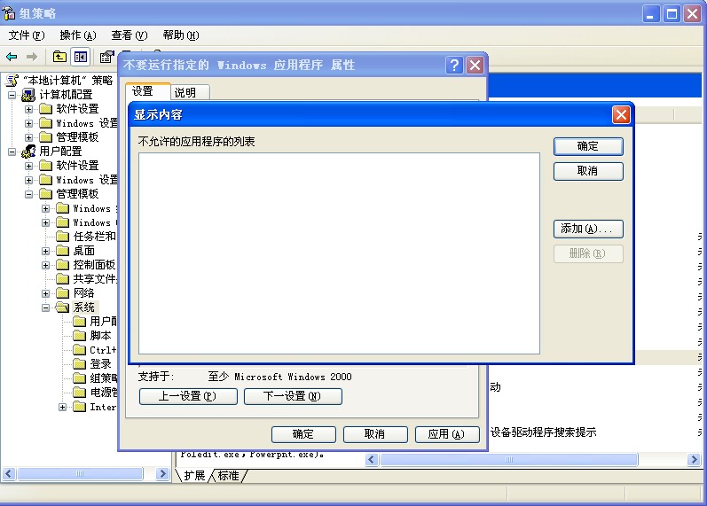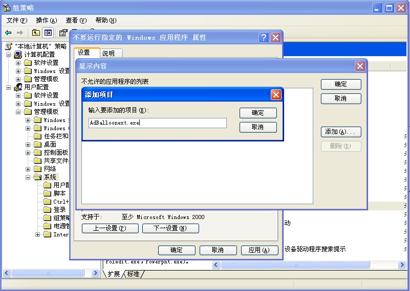 开始—>运行—>输入gpedit.msc确定—>进入用户配置—>管理模板—>系统—>双击右边的不要运行指定的windows应用程序—>选已启用—>点击显示—>在新窗口中点击添加—>输入AdBalloonext.exe确定。