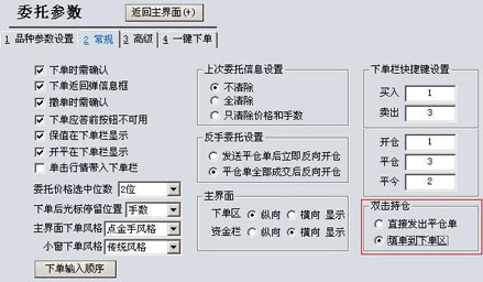 2.点击菜单树“设置-委托参数”,选择“常规”,设置双击持仓为“填单到下单区”,如下所示: