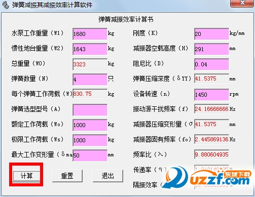 通过输入水泵工作重、惯性地台重、弹簧数量及额定极限工作荷载、最大工作变形量、刚度减振器空载高度设备转速等数据来计算,减振器压缩变形量和减振器固有频率。