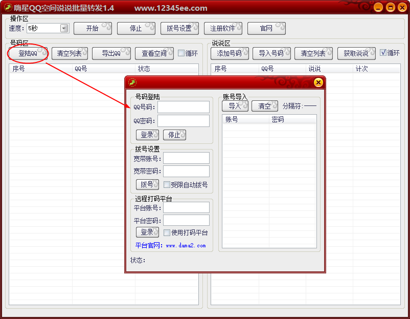 1、点击【登录QQ】导入用来刷转发的QQ小号