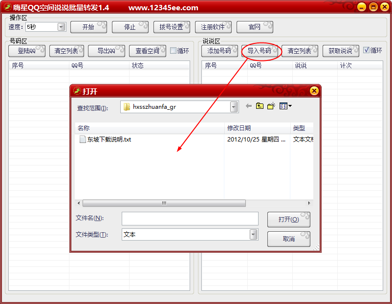 2、点击【导入号码】导入被刷的QQ号