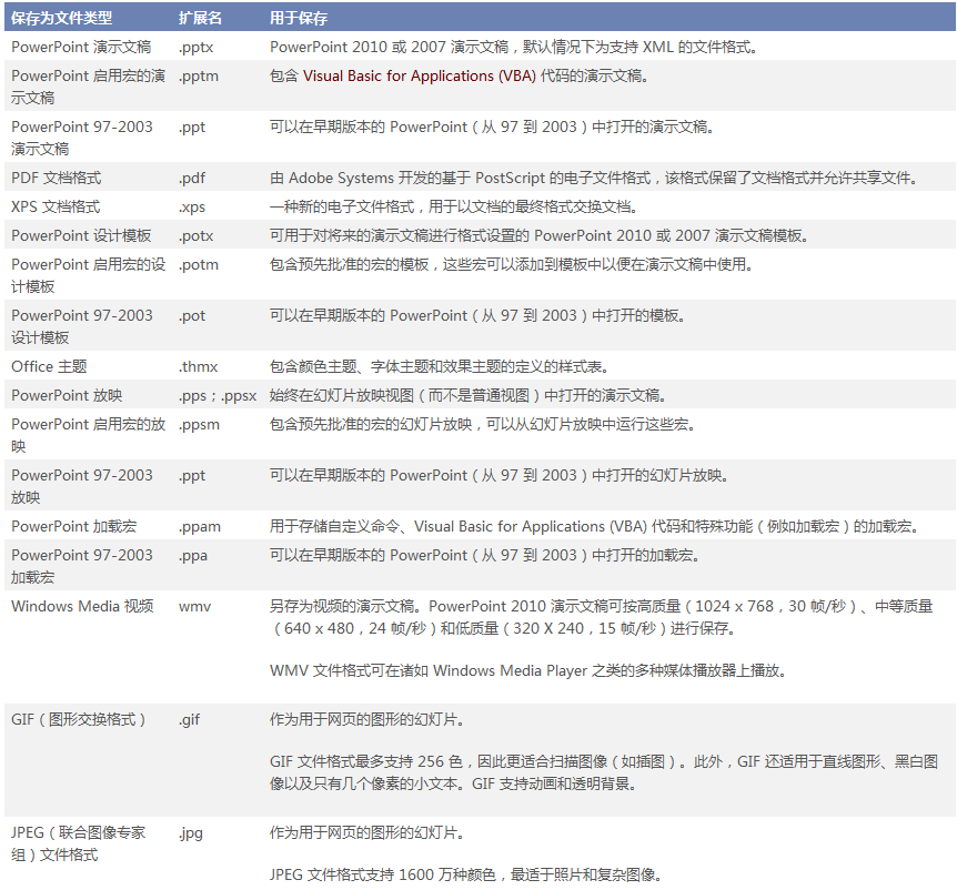 使用 Microsoft PowerPoint 2010,可以将您的演示文稿保存为下表中所列的任意文件类型。