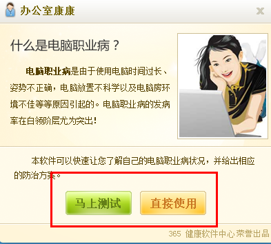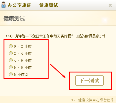 软件安装简单,无须任何设置即可使用。第一次运行“办公室康康”,软件会提醒您先进行一个简单健康测试,让您快速了解自己的电脑职业病状况,根据测试结果,“办公室康康”会自动生成科学且人性化的防治方案。