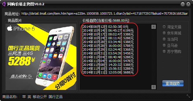 网购价格走势图是一款能够查看、对比各网站网购价格趋势的软件。软件绿色小巧、使用简单,方便,只需复制商品地址即可查看相关网络商城的价格走势信息。尽管双11过去了,但对于喜欢网购的朋友们来说绝对不只局限于1天的购物,此网购价格对比软件绝对必备!