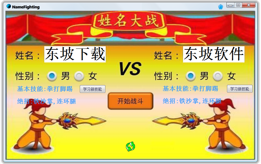 姓名大战(NameFighting)是一款简单有趣的关于姓名的游戏。输入双方姓名,自定义技能名称,点击开始战斗即可,程序会显示非常有趣的战斗动画,娱乐逗趣、休闲打发时间之精品,赶紧来下载体验下吧!