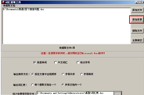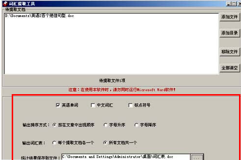 可以将一个或多个Word文档(.doc;.docx)、网页文件(.htm;.html)或文本文件(.txt)中所有(中文或英文)单词提出来形成词汇表。