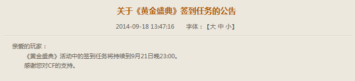 有很多玩家像知道cf黄金盛典签到任务什么时候结束,cf黄金盛典签到将会在9月21日23点结束,现在东坡小编就给大家带来cf官网关于《黄金盛典》签到任务的公告,一起来看看吧。