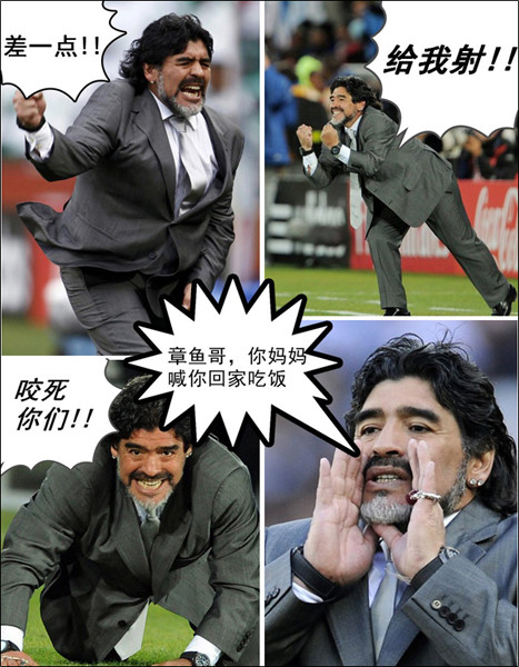 球场上的马拉多纳,丰富的肢体语言加上形象的旁白,内心对话就一目了然啦!
