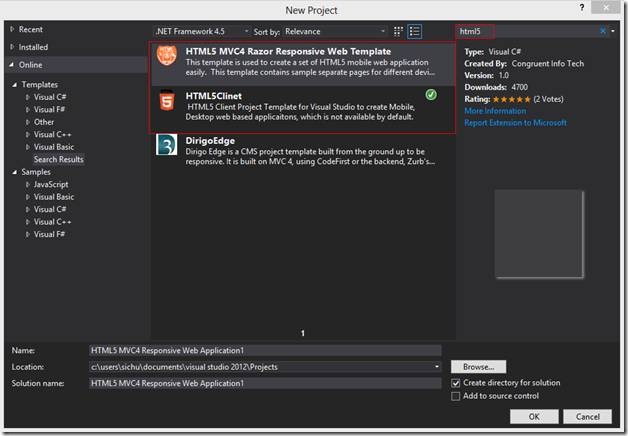 在Visual Studio 2012里的New Project下搜索关键字html5: