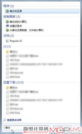 1.在Windows 7桌面点击视窗图标,在搜索栏中输“备份”,选择“备份和还原”。