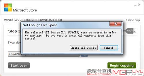 10.下一步点击“Begin copying”后,会弹出提示窗,警告闪存盘将会被格式化,选择“Erase USB device”。