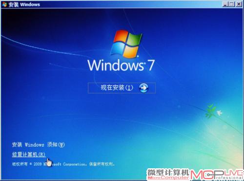 13.启动后就是Windows 7操作系统的安装界面,不要选择“现在安装”,而是选择“修复计算机”。