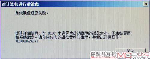 17.如果新硬盘的容量小于旧硬盘,会弹出警告窗“系统映像还原失败”。如果不是,那么恢复操作会顺利完成,重启之后Windows 7操作系统就在SSD上安了家。