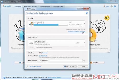 21.运行Acronis True Image Home 2012软件,选择“Back up system”,在弹出窗口中点击“Multiplepartitions selection”。
