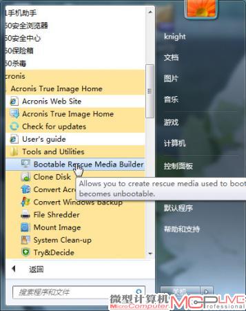 24.接下来制作闪存盘启动盘,在开始程序中找到“Acronis”、“Tools and Utilities”,运行“Bootable Rescue Media Builder”。