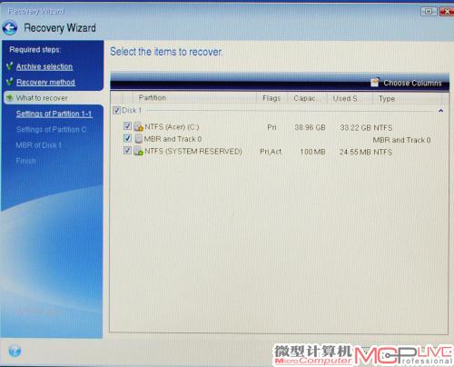 34.这里可以看到tib镜像文件包含了系统分区、100MB系统保留分区、MBR分区表和零磁道信息,恢复的时候当然要全选。