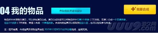 7、物品栏中未领取的道具,可以参加道具合成。使用道具合成功能,可将物品栏中任意3个英雄(7天体验、普通)合成一个普通英雄,将任意3个皮肤(7天体验、普通)合成一个普通皮肤。合成出的道具可领取到任意大区,也可以继续参与合成。