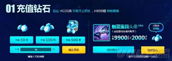 1、在活动页面上使用Q币充值钻石,1Q币可充值10钻石。在游戏客户端购买并使用非永久召唤师图标“魅蓝面具”,可获赠150钻石,每个QQ号码只能获赠一次。总钻石持有量可以在页面上查询。