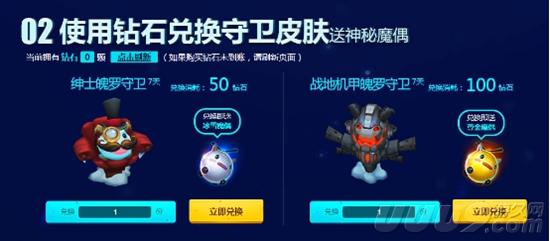 2、使用钻石可兑换珍稀守卫皮肤:其中50钻石可兑换一份“绅士魄罗守卫(7天)”,赠“冰雪魔偶”一个;100钻石可兑换一份“战地机甲魄罗守卫(7天)”,赠“尊金魔偶”一个。若兑换多份珍稀守卫皮肤,其使用时间叠加计算。