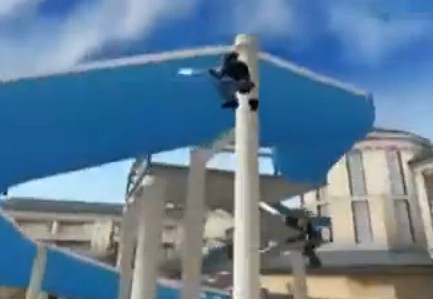 大家沿着最长的蓝色滑梯,往左边壁上的第一个大圆柱走,一直走到处于悬空状态,然后就一直按蹲键,直到人物按蹲或跳时没什么反应了,这样大家就差不多快成功了,然后再向左边走一点点,这样大家就会发现自己已经卡在柱子中间了。以下是效果图: