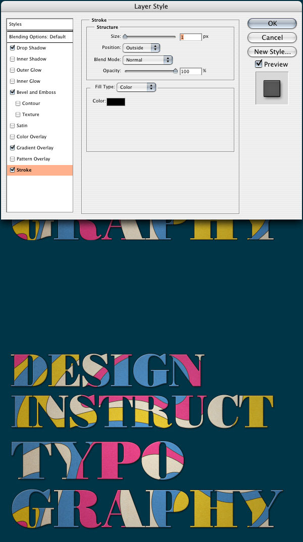 现在我们继续,我们要添加在每个形状的描边。点击图层面板下面的添加图层样式,然后描边,颜色为黑色(#000000),边框大小为2. 然后复制图层样式,把每个图层都粘贴一次。