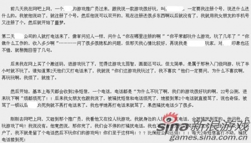 该玩家回家后登陆了游戏,发现该新游并非自己喜欢的类型,就不再玩了。谁知道第二天该玩家就收到了推广员的电话,在玩家表示不喜欢玩该游戏时,推广员开始打破砂锅问到底,问该玩家为什么不喜欢。在该玩家不厌其烦挂断电话后,每天都会收到该推广员的骚扰,短信、电话轮番上阵,就连该玩家的女朋友也受到了连累,不断被推官员质问为什么不玩游戏。后来,该玩家再次去网吧上网,推广员在发现该玩家后扬言:“不玩游戏你就完了,我们会不停的打骚扰电话。”
