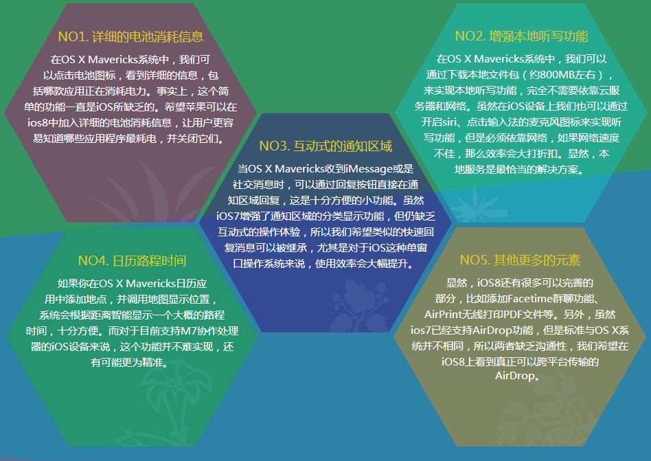 虽然ios8并没有真正的问世,不过对于这个即将诞生的系统,人们总是给予厚望!希望这个升级产品能完善更多的地方,比如添加Facetime群聊功能、AirPrint无线打印pdf文件等。