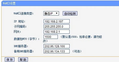 1.登陆主路由,打开网络参数-WAN口设置(此图是从交换机接出,上面有一VLAN,所以设置了静态IP,如果是家用路由器,可选择PPPOE连接方式)。