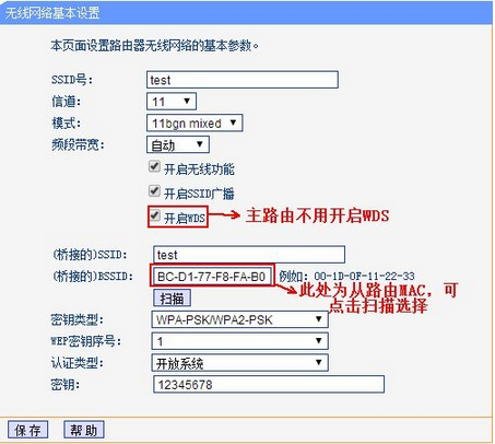 2.SSID号及信道、模式等信息必须与主路由保持一致,另开启WDS功能(主路由无须开启),点击扫描找到主路由的MAC,添加进来即可,另密钥等信息根据需要设置。