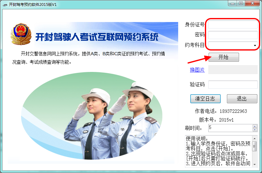 1、输入学员身份证,密码及预考科目,点击[开始]。