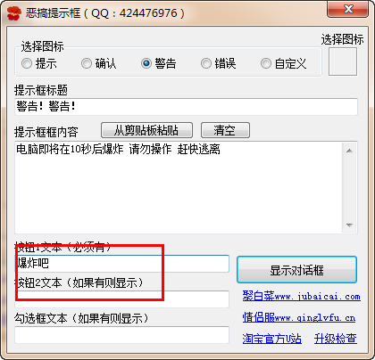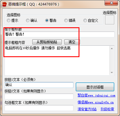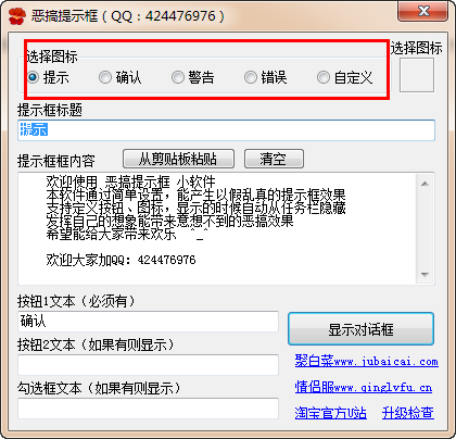 想在工作休息的时候恶搞一下放松下么,恶搞提示框工具是一款小巧有趣的提示框恶搞工具,通过各种自定义功能,来恶搞一下好友,让大家都开心一下,非常的有趣,感兴趣的就来下载试试吧。