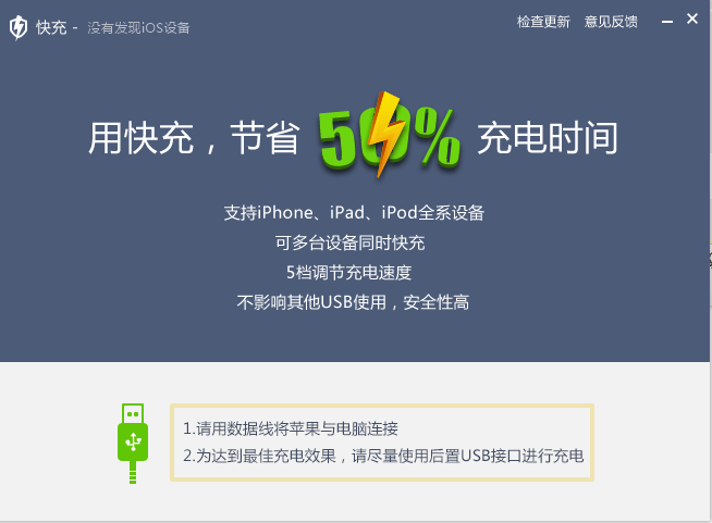 通过电脑的USB接口即可轻松实现快速充电,充电速度最大可提升40%,并允许用户自行调节充电速度。软件不受主板类型限制,任何台式电脑或笔记本均可开启快充功能。