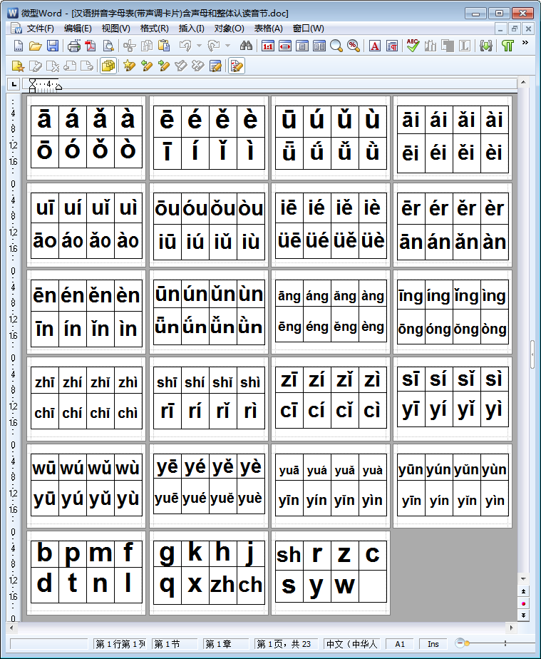 这是一份doc格式word版可供打印使用的拼音字母表——完整一点介绍的话,这是一份带声调卡片的、含声母和整体认读音节的汉语拼音字母表。相信对于幼儿园的老师们或是低年级的语文老师们来说,这份汉语拼音字母表都是十分具有实用性的——当然,家长在辅导孩子作业的时候,这份汉语拼音字母表其实也可以扮演十分重要的学习资料哦!点击本文相应的下载地址进行下载后,你就可以将这份拼音字母表归入囊中了,有需要的朋友你还在犹豫什么,快来东坡下载吧!