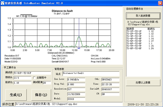 1. 如果处理完一个站点,需要接着处理下一站点数据,步骤:切换到保存驻波的WORD文档,保存,关闭。切换到程序,将程序窗口底部的保存位置内的路径删除,如上图的D:\software\驻波仪仿真\包 (2)\Support\qq.doc。点保存(或者快捷键Alt+S),程序会要求打开一个新的WORD文档,重新选个保存驻波图的WORD文档就可以了。再重复上面动作,使用批处理功能处理。