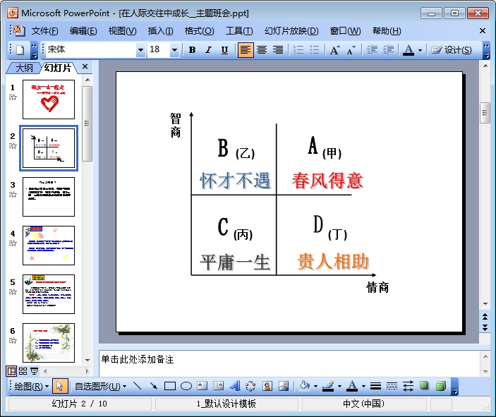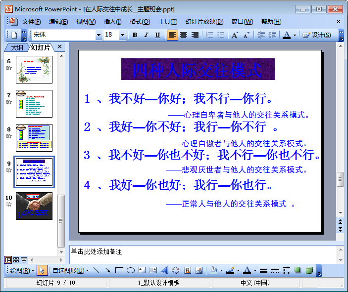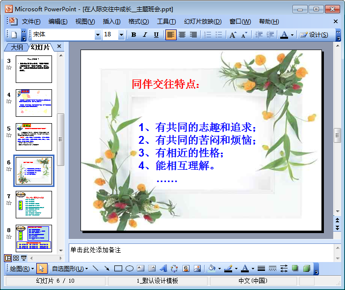 这是一份适合作为人际交往主题班会课件使用的ppt——一份名为“朋友一生一起走——在交往中获得成长”的ppt课件(以下简称为人际交往主题班会ppt)。该人际交往主题班会ppt共由10页组成,在内容设计上十分有趣,充满趣味性,便于学生理解和接受,如果你需要这份ppt课件的话,只需轻轻点击本文相应的下载地址进行下载即哦!