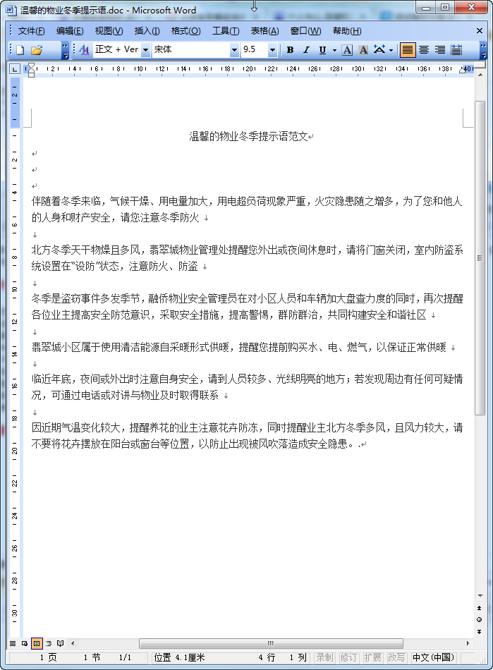 在寒冷的冬季大家一定要注意自身的安全问题,这里有一篇温馨的物业冬季提示语范文,里面都是一些温馨的冬季提示语(物业专用),感兴趣的物业公司可以来这里看看,喜欢的话可以点击下载的地址免费下载使用!