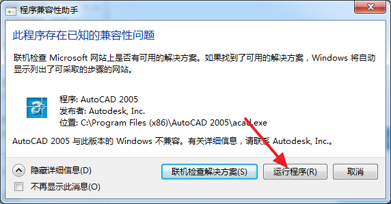 然后运行桌面的AutoCAD2005的图标,提示兼容性问题,点“运行程序”