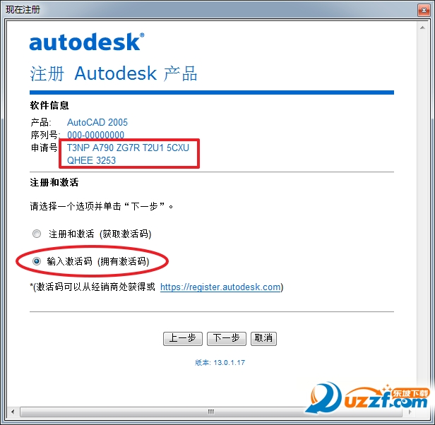 然后这里会有一个申请号,复制下来;下面勾选“输入激活码”,然后点“下一步”