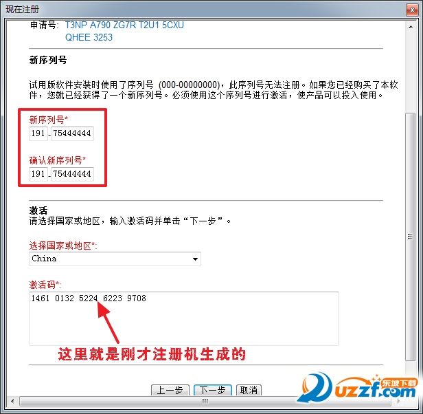 将我们的申请号复制下来,下方会自动生成激活码 (提示:申请号每4个字符之间有个空格,你直接从软件上复制的还可能空一行)