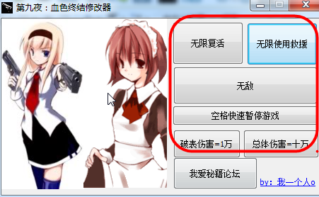 第九夜血色终结六项修改器其实就是同名游戏的最新修改软件,他最大的不同就是表现在人物的无限复活,还能实现给敌人十万的伤害等等的功能,如果想要这样的功能,就赶紧来此下载吧!