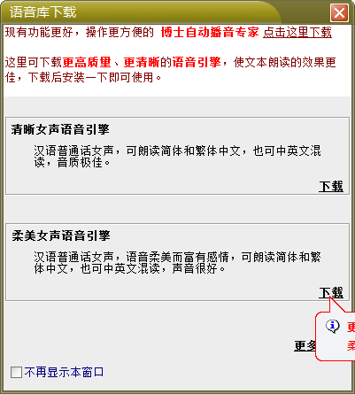 有的,软件打开时,会提示你下载“清晰女声”和“柔美女声”,这两个声音比软件自带的“小巧女声”好很多。