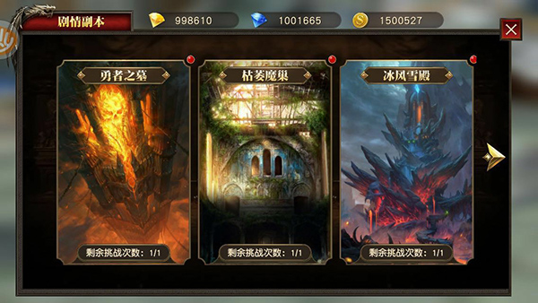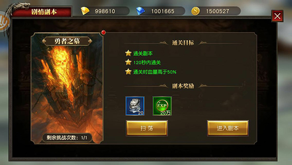 玩家点击“进入副本”后,即可开启挑战,在连续击杀2波小怪后,即可遇到最终BOSS,由于剧情副本死亡后,可以免费复活。因此只要在限定时间内击杀完最终BOSS即可挑战成功,获得相应的奖励。当然如果要达成3星目标,还是需要有一定的实力再进行挑战为好。
