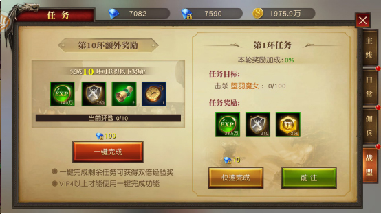 每天都有10环任务,任务内容为击杀指定数量的野外怪物,通过消耗绑定钻石可以一键完成10环任务并且获得多倍奖励,而完成10环时还有额外奖励。前期完成的成就可以囤积大量绑定钻石,因此推荐玩家每天消耗绑钻,领取双倍经验奖励。(一键完成需要VIP4以上才能使用哦)