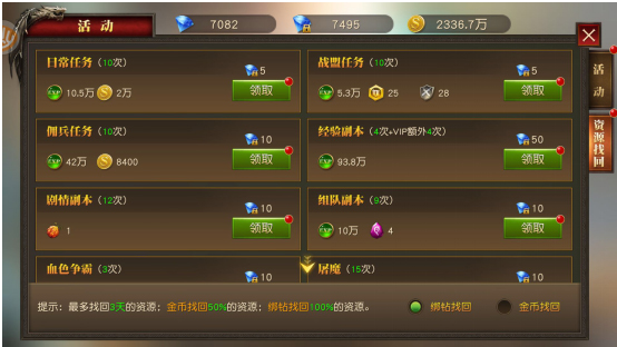 对于前一天忘记做或者没时间参加的活动任务,是不是觉得心很痛?别慌,资源找回可以快速帮你找回未参与的活动奖励。用金币可以找回50%的资源,绑钻可以找回100%的资源,最多甚至可以找回3天的资源,再也不用担心爆肝了!