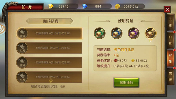 玩家每天可以通过使用佣兵凭证,截取对应的讨伐任务,完成后可获取大量经验和金币。佣兵凭证品质从高到底分别为橙色品质,紫色品质,蓝色品质和绿色品质,完成对应的讨伐任务一次可以获得4倍,2倍,1.25倍和1倍奖励。佣兵凭证可以通过击杀野外小怪和商城购买获得。