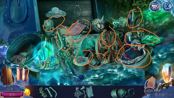去果园,从门上拿到凿子,在鸟窝里得到烧烤夹子(两块拼成一块),回小屋,在水龙头下方用凿子得到注油器,开果园的门,得到挂锁,点开书后篮子,得到坚果钳。用烧烤夹子夹起曲柄,安上,把铁链弄到神兽旁边,用挂锁连接铁链和木板的环,把木板拖开,得到茶巾。