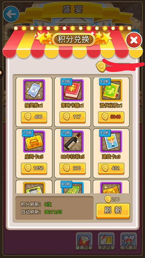 下面我们该聊聊宴会派对了。前面我也说了家族战获得的金币就多兑换礼包这个是没有错的。因为当有人开豪华派对的时候,就可以送上了,一个礼包有1500多积分。而假如没有礼包的话在豪华派对上送上随礼也会比小型派对得到的多。所以到了宴会冲榜的时候我们应该要往豪华派对多走走。得来的积分也挺好的,可以换建设卡,这个是除了充钱以及抽奖获得建设卡的唯一途径(这是我发现的,不知道还有其他途径不。)当我们遇上打折的时候就换建设卡吧要不挺亏的,建筑卡和座驾卡打折也可以多换。其实打折都可以换。那些个秘笈呢就看自己心情,最重要的还是卡嘛。