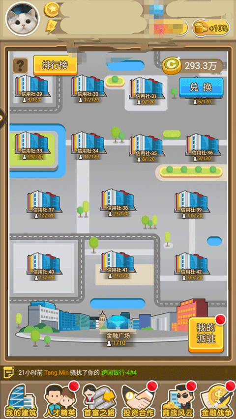 很多人都没有注意到当我们往下拉的时候,会有一个金融广场,这个地方呢,可以说是挺福利的,要是你的等级够高他给的提成也高。自然不用去占领其他地方。所以大家别忘记了这还有那个地方。